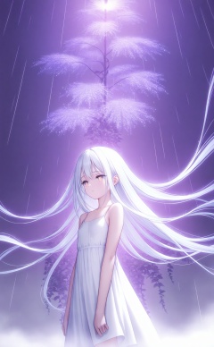 masterpiece,best quality,high quality,loli,white background,Dundar effect,a lot of purple vines,vines covering half of the painting,delicate plant details,a girl,girl,petite girl,long white hair,golden pupils,white dress,bare feet,side,side,upper body,head up,sad eyes,rain,light,figure light,petals,purple filter,left,fog,dream,unreal,Blur,float light,