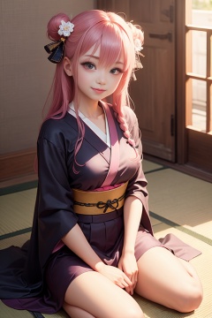 1girl, long hair, pink hair, solo, blush, japanese clothes, looking at viewer, hair ornament, smile, kimono, pink eyes, sitting, purple eyes, hair between eyes
