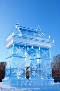 miluo_bing, scenery, no humans, outdoors, sky, snow, blue sky, tree, building, winter, day, ice sculpture <lora:万物可冰雕sd1.5-v1.4:0.7>