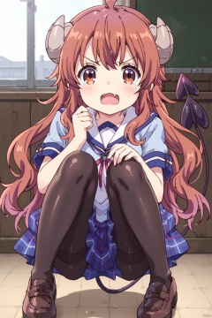1girl,solo,long hair,looking at viewer,blush,open mouth,skirt,brown hair,brown eyes,school uniform,tail,ahoge,horns,shoes,(one fangs:1.3),shiny,tears,shiny hair,plaid  black,((pantyhose:1.3)),plaid skirt,demon girl,demon horns,demon tail,curled horns,yoshida yuuko \(machikado mazoku\)