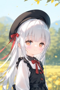 good work, (best quality), illustration, depth of field, (color),masterpiece,best quality,petite,cute,loli,artist:usashiro_mani,artist:houkisei,[artist: wlop],artist:chen_bin,[[artist:ke-ta]],artist:ciloranko,1girl, solo, long hair, (little_girl:1.2),(petite:1.1),bright_pupils,blue eyes,gothic_lolita,dress,loli,looking at viewer, blush, smile, bangs, white hair, shirt, long sleeves, hat, dress, ribbon, brown eyes, closed mouth, hair ribbon, upper body, outdoors, frills, blurry, red ribbon, black headwear, blurry background, loli
