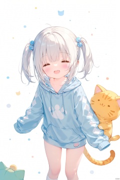 good work, (best quality), illustration, depth of field, (color),masterpiece,best quality,petite,cute,loli,artist:usashiro_mani,artist:houkisei,[artist: wlop],artist:chen_bin,[[artist:ke-ta]],artist:ciloranko,1girl,closed_eyes,hood,twintails,long_sleeves,hair_ornament,animal_costume,socks,smile,cat_costume,bangs,sleeves_past_wrists,sleeves_past_fingers,open_mouth,blush,hair_bobbles,tail,animal_hood,standing,simple_background,white_background,hoodie,loli,plaid, argyle legwear, argyle,stuffed_toy,takanashi_hoshino,White hair,