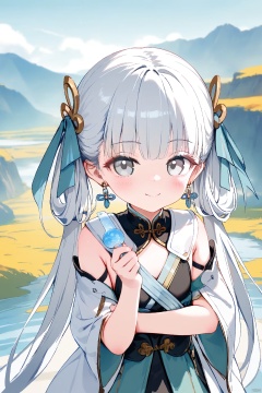 artist:usashiro_mani,artist:houkisei,[artist: wlop],artist:chen_bin,[[artist:ke-ta]],artist:ciloranko,,good work, (best quality), illustration, depth of field, (color),masterpiece,best quality,,petite,cute,loli,1girl, solo, long hair, looking at viewer, smile, bangs, hair ornament, holding, twintails, jewelry, closed mouth, upper body, white hair, earrings, grey eyes,jinhsi