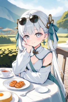 artist:usashiro_mani,artist:houkisei,[artist: wlop],artist:chen_bin,[[artist:ke-ta]],artist:ciloranko,,good work, (best quality), illustration, depth of field, (color),masterpiece,best quality,,petite,cute,loli,1girl, solo, long hair, looking at viewer, smile, bangs, blue eyes, hair ornament, long sleeves, ribbon, holding, sitting, hair ribbon, white shirt, white hair, earrings, outdoors, detached sleeves, food, cup, grey eyes, chair, table, sunglasses, eyewear on head, plate, teacup, tea, saucer,,jinhsi