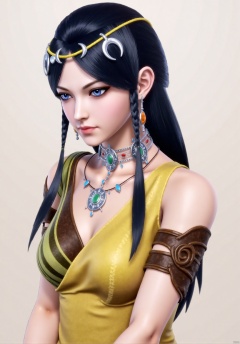 1girl, solo, long hair, blue eyes, black hair, hair ornament, dress, jewelry, upper body, necklace, looking to the side, armlet,AL
