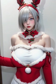 1girl solo breasts looking at viewer short hair blue eyes large breasts dress bare shoulders white hair hairband detached sleeves mole hair over one eye lips fur trim cosplay bell christmas mole under mouth yorha no. 2 type b