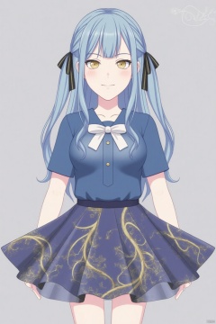 (grey background:1.2),looking at viewer,(SOLO:1.4),outline,simple background,full body,looking at viewer,(((arms at side))),togawa sakiko,long hair,bangs,ribbon,hair ribbon,black ribbon,two side up,blue hair,grey hair,sidelocks,blunt bangs,yellow eyes
