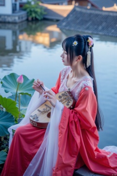 This is a high-resolution photograph capturing a serene scene of a young woman playing a traditional Chinese guqin,a seven-stringed zither,in a tranquil outdoor setting. The woman,with fair skin and long,dark hair adorned with delicate white flowers,is dressed in a flowing,red silk robe with intricate embroidery along the sleeves and neckline. The fabric appears ethereal and light,gently rippling as she holds the guqin with both hands., The background features a serene pond with rippling water reflecting the blue and purple hues of the sky,suggesting a twilight or early evening setting. Lush green lily pads and lotus flowers are visible around the edges of the pond,adding to the peaceful ambiance. The light is soft and diffused,casting a gentle glow that highlights the textures of her robe and the intricate patterns on the guqin., The image exudes a sense of calm and introspection,with the woman's focused expression and the gentle movements of her hands as she plays the instrument. The overall aesthetic is one of traditional elegance and natural beauty,capturing the essence of ancient Chinese culture and artistry.