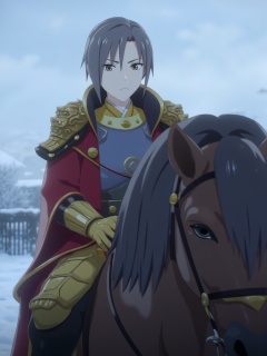 2D style,A boy in armor is riding,outdoors,on a snowy day,black eyes,black hair,