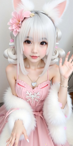1girl, solo, hair ornament, dress, animal ears, bare shoulders, flower, white hair, cat ears, hair flower