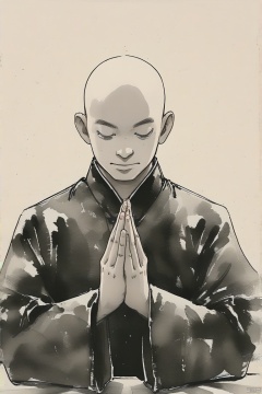 ,illustration,ink painting,solo, bald, 1boy, own hands together, male focus, praying