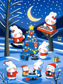 tuzi,A lively winter scene with cute,white bunny characters rocking red scarves and hats. They're busy decorating a Christmas tree,handing out gifts,and playing music. The backdrop features a snowy forest with a crescent moon and stars in the sky. The scene bursts with festive colors and whimsical,cartoonish style,capturing the joyful spirit of the holiday season.,,<lora:tuzi_v1:0.8>
