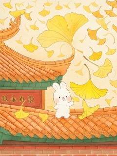 tuzi,A whimsical,digital drawing features a cute,fluffy white bunny soaring through the air,clutching a yellow ginkgo leaf. Below,a cheerful brown bear stands on a tiled roof,waving at the bunny. The roof is detailed with red tiles and green eaves,topped with a traditional Chinese dragon. The background is a soft,yellow sky with more ginkgo leaves floating around. The style is playful and minimalist,with a pastel color palette.,,<lora:tuzi_v1:0.8>