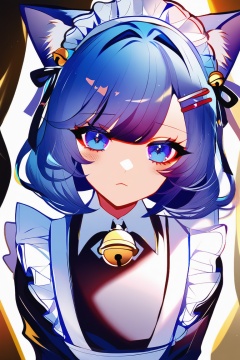 1girl,solo,long hair,looking at viewer,blush,bangs,blue eyes,simple background,hair ornament,white background,dress,bow,ribbon,animal ears,closed mouth,blue hair,frills,hairclip,cat ears,apron,black dress,collar,maid,maid headdress,sparkle,bell,detached collar,white apron,jingle bell,neck bell,maid apron,white collar,(artist:sheya:0.6),