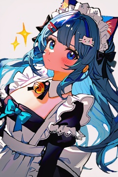 1girl,solo,long hair,looking at viewer,blush,bangs,blue eyes,simple background,hair ornament,white background,dress,bow,ribbon,animal ears,closed mouth,blue hair,frills,hairclip,cat ears,apron,black dress,collar,maid,maid headdress,sparkle,bell,detached collar,white apron,jingle bell,neck bell,maid apron,white collar,(artist:quasarcake:0.6)