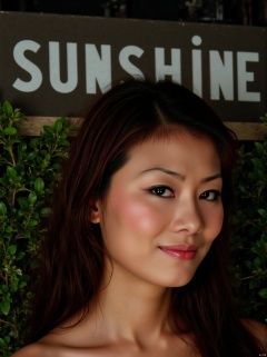 (RAW photo, 4k, realistic, exquisitely detailed skin),masterpiece,best quality,unity 8k wallpaper,ultra detailed,cinematic look,natural skin texture,extremely realistic skin texture,finely detailed face,(film grain:1.2),cinematic angle,Fujifilm XT3,,(highlydetailed),(bright scene),(A serene portrait of a stunning woman, gazing directly into the lens with an air of detachment, her piercing eyes seemingly oblivious to the viewer's presence. Soft, natural lighting casts a warm glow on her porcelain skin, while her raven tresses cascade down her back like a waterfall of night. Her lips, painted a subtle crimson, curve into a gentle, enigmatic smile, hinting at secrets kept behind an impenetrable facade.),(detailed lighting),(contrast),(mysterious atmosphere),,vivid illumination,,masterful technique,,harmonious composition,,immersive atmosphere,,stunning visuals,The bold emblazoned words SUNSHINE amidst lush greenery create a striking visual counterpoint to her melancholic expression, bathed in the soft glow of street lamps.
