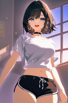 1girl, shorts, solo, breasts, choker, dolphin shorts, navel, shirt, crop top, white shirt, blue eyes, black choker, midriff, black shorts, looking at viewer, open mouth, smile, earrings, short sleeves, jewelry, short shorts, stomach, night, cowboy shot, short hair, medium breasts, thighs, black hair, collarbone, mole, \:d, mole under eye, brown hair, standing, indoors, window, medium hair, large breasts, hoop earrings