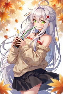 1girl, solo, long_hair, skirt, green_eyes, hair_ornament, holding_cup, cup, holding, disposable_cup, sweater, looking_at_viewer, blurry, off_shoulder, white_hair, black_skirt, drinking_straw, blurry_foreground, hairclip, x_hair_ornament, leaf, depth_of_field, long_sleeves, autumn_leaves, two_side_up, bare_shoulders, hair_between_eyes, very_long_hair, autumn, off-shoulder_sweater, blush, plaid,artist:yizhenyunping