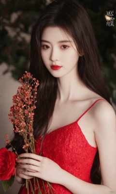 A photograph of beautiful hubggirl, (super realistic, best quality:1.25), depth, cinematic light, BREAK Young Asian hubggirl, long dark brown hair, red sleeveless dress, red lips, holding flower, hair back, blurred bg. BREAK perfect hands, perfect light, vibrant colors, intricate details, highly detailed skin, pale skin, photorealistic, raw, analog, taken by Sony Alpha 7R IV, Zeiss Otus 85mm F1.4, ISO 100 Shutter Speed 1/400, Vivid picture, intricate background,