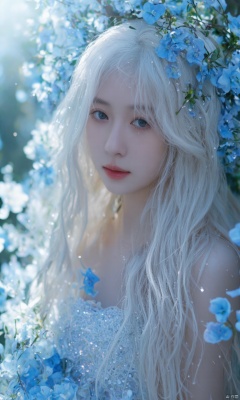 A stunning blonde Hubggirl w/ long ethereal white hair, adorned w/ blue flowers, air full of sparkly droplets, soft light, dreamy atmosphere.