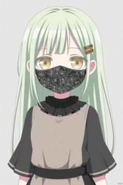 (grey background:1.2),looking at viewer,(SOLO:1.4),outline,simple background,full body,looking at viewer,(((arms at side))),Wakaba Mutsumi,long hair,green hair,bangs,blunt bangs,yellow eyes,hair ornament,hairclip,black_mask