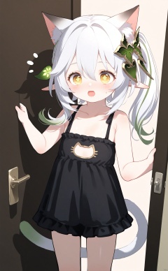 masterpiece,best quality,illustration, dark style, [Artist miwano rag],[Artist toosaka asagi],[Artist wlop],[Artist chen bin], 1girl, solo, long hair,loli,loli,loli, (little_girl:1.2),petite:1.1, cat girl, cat ears, cat tail, small breast,yellow eyes, cat pupils, white hair, green hair, Surprise, half close eyes, hair ornament, gradient hair, low twintails, nahida \(genshin impact\) ,opening the door, open mouth, standing beside the door, hand on the door,