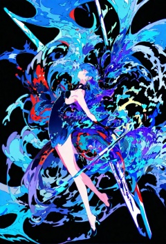 1girl, qk1, colorful, solo, black background, sparkle, dress, long hair, blue hair, abstract, profile, earrings, breasts, full body, simple background, from side, jewelry, small breasts, bare legs, very long hair, sleeveless, high heels, floating hair, blue theme, standing on one leg, sword, gloves, sleeveless dress, star \(symbol\), blunt bangs, red eyes, black gloves, standing, weapon, bare shoulders, gradient background, fingerless gloves,A young girl with long, flowing hair. she is wearing a black and white dress with a red star on her head. the sword on either side of her is long and pointed, with a blue blade. the background is dark blue, and there are small yellow stars scattered around the girl.masterpiece, best quality, newest, absurdres, safe <lora:okra_v2.0-000014:1>