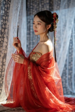 She was wearing a semi transparent red silk dress with golden patterns, revealing one shoulder.