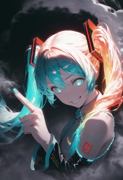 masterpiece,best quality,amazing quality,very aesthetic,absurdres,newest,impactful picture,offcial art,movie perspective,(aos:0.5),(fajyobore:0.5),(chiaroscuro:0.5),Hatsune Miku,limited palette,black background,colorful,vibrant,glowing outline,neon,blacklight,looking at viewer,fog,from_side,from_above,face focus,evil_grin,pointing,glowing_hair,brilliant brilliance,
