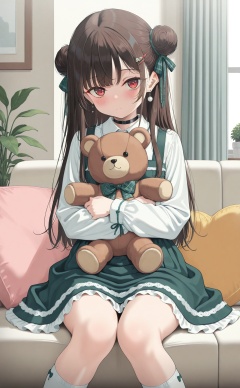 masterpiece,best quality,high quality,loli,1girl,teddy bear,stuffed toy,stuffed animal,red eyes,solo,looking at viewer,sitting,green dress,white shirt,green bow,long hair,white socks,shirt,long sleeves,dress,choker,hair bun,socks,hair ornament,closed mouth,bow,indoors,hugging object,hair ribbon,bowtie,collared shirt,ribbon,holding stuffed toy,hairclip,frills,collar,black choker,green bowtie,kneehighs,green ribbon,black hair,pinafore dress,window,hugging doll,plaid bowtie,food,frilled dress,plaid,holding,plaid bow,sleeveless dress,plant,blush,potted plant,brown hair,earrings,sidelocks,curtains,