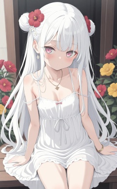 masterpiece,best quality,high quality,loli,1girl,solo,flower,hair ornament,long hair,dress,breasts,white hair,bare shoulders,hair bun,sitting,white dress,cleavage,hair flower,closed mouth,jewelry,