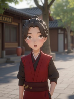 3D style,A boy with black hair is wearing Chinese clothes outdoors,