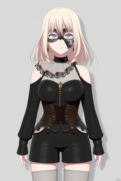 (grey background:1.2),looking at viewer,(SOLO:1.4),outline,simple background,full body,looking at viewer,(((arms at side))),Misumi Uika,blonde hair bangs,purple eyes,smile,medium hair,hair between eyes,black_mask,long sleeves, black shorts, black dress, dress,grey socks,kneehighs,black high heels, off shoulders, black pants, corset, choker, ascot,gold_trim, black earrings, jewelry,
