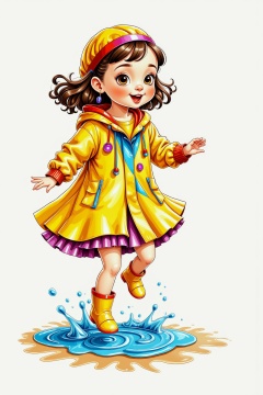 SK,SK,Hand-drawn illustration,1girl,The little girl in the yellow raincoat and boots jumped happily in the puddle in the rain. Every time she fell,she would splash high water,but she didn't care. Her laughter was crisp and loud. The rain wet her face,but she couldn't cover her bright eyes and bright smile.,