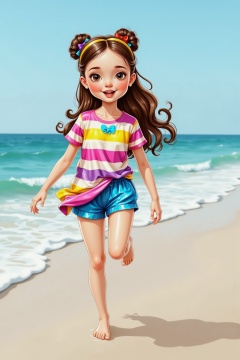 SK,SK,girls wearing colorful striped T-shirts and white shorts,on the beach. She was barefoot,chasing the waves,laughing heartily. When the waves came,she jumped high,the splash wet her skirt,and then crouched down to draw love on the beach with her fingers.,