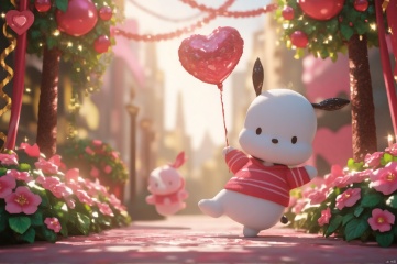 A whimsical scene unfolds as pochacco, surrounded by lush greenery and vibrant pink flowers, poses amidst a festive Valentine's Day setting. A stunning display of heart-shaped balloons, glittering garlands, and sparkling streamers adorns the backdrop, while a delicate the foreground. Soft, warm lighting illuminates the scene, casting a romantic glow on 8k, CG,best quality,HDR,UHD,camera uses 35mm f/2.0 wide-angle lens, uses 35mm f/2.0 wide-angle lens