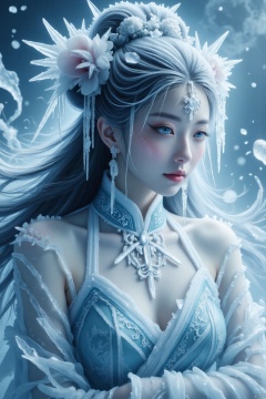 frozen,hanfu,a woman, cold surface, sharp crystal formation, glistening ice covering the body, eyes frozen in time, surrounded by frost, cold blue-white tone, delicate and powerful, mouse frozen in motion, frozen world, mysterious and cold atmosphere.