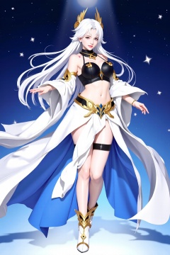 a medium-sized animated female warrior is depicted in a stark contrast of white, blue and gold. Her white hair is cascading over her shoulders, adding a touch of warmth to the scene. She's dressed in a flowing white and gold costume, adorned with a black bra and a gold belt. Her boots are adorned with gold accents, adding depth to the composition. The backdrop is a deep blue, with white stars dotting the sky.,<lora:models/4074/6cec3ed1-09.safetensors:0.8:0.8>