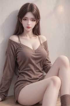 Masterpiece, the best quality, high quality, (colorful) , breasts,,(brown hair:1.4),(long legs:1.3),photograph,1girl,solo,long hair,looking at viewer,brown hair,long sleeves,brown eyes,sitting,closed mouth,socks,off shoulder,sweater,lips,sleeves past wrists,realistic,nos
