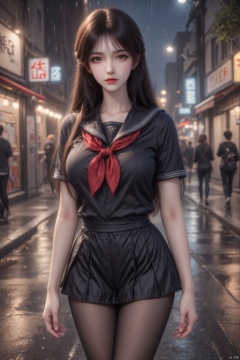 Masterpiece, the best quality, high quality, (colorful) , breasts,,(brown hair:1.4),(long legs:1.3),1girl, solo, looking_at_viewer, black_pantyhose, black_hair, swept_bangs, very_long_hair, brown_eyes, looking_at_viewer, black_skirt, miniskirt, pleated_skirt, black_sailor_collar, black_blouse, red_neckerchief, standing, outdoors, city, night, rain, street,