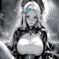 1girl solo breasts looking at viewer blush smile open mouth large breasts hair ornament thighhighs monochrome greyscale multicolored hair hairclip cross nun habit