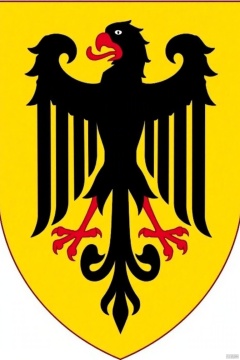 shield is adorned ,Medieval Family Emblem,a vibrant yellow shield features a black silhouette of a black eagle with a red beak. The eagle's wings are spread wide, adding a pop of color to the otherwise monochromatic image. The silhouette of the eagle's head is centered on the shield, which is adorned with a black design that adds a touch of contrast to the yellow background.