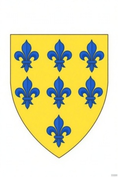 shield is adorned ,Medieval Family Emblem,a vibrant yellow shield is adorned with five blue fleur de lis symbols. The shield is set against a stark white backdrop, creating a striking contrast to the vibrant yellow of the shield. The fleur-de-lis symbols are adorned with a blue ribbon, adding a pop of color to the image.