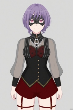 black_mask,red shorts,long sleeves,see-through sleeves,garter straps,red thighhighs,jewelry, corset, red footwear, puffy sleeves, black shirt, red nails, black earring