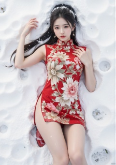 Realistic photo, 1girl, long hair, fair skin, big breasts, High slit chinese cheongsam, (shiny pantyhose), long legs, red high heels, full body, lying in the snow, (falling snow), (body covered with snow), heavy snow, top view,