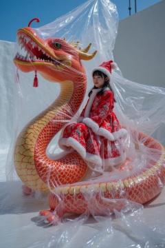 Plastic wrap covers the entire scene, A girl in a Christmas costume sits on a giant Chinese dragon,loong,plastic film