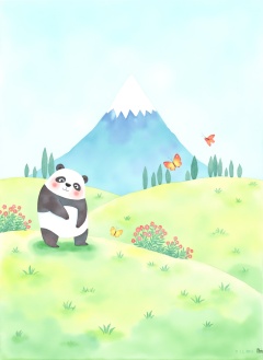 CGArt illustrator,A flat color style vertical background illustration designed for a promotional setting. The background features a majestic snow-capped mountain in the distance, a vibrant green grassland in the foreground with patches of colorful flowers, small bushes scattered throughout, and butterflies flying around. The design should be minimalistic yet lively, using flat color areas without outlines, creating a cheerful and harmonious natural atmosphere, suitable as a backdrop for panda illustrations.