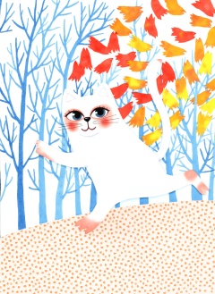 CGArt illustrator,vector,flat illustration,bold contrasting colors,A blue white red and yellow composition,a cat is running through a colorful pattern,Children's illustration style,simple shapes,flat composition,Abstract,minimalist style,minimalist illustration,asymmetrical forms,bold patterns and typography,