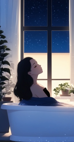 1girl, window, solo, night, long hair, star (sky), plant, sky, bathtub, starry sky, indoors, night sky, curtains, black hair, bottle, bare arms, blanket, profile, closed mouth, bare shoulders, signature, light particles, potted plant, tree, flower, sleeveless,<lora:city life:0.8>,