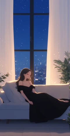 dark stone,1girl,couch,solo,window,indoors,closed eyes,plant,night,pillow,sleeping,off shoulder,long hair,dress,sky,bare legs,on couch,sitting,black hair,potted plant,bare shoulders,barefoot,night sky,star (sky),black dress,cityscape,brown hair,city,curtains,blush,bangs,off-shoulder dress,parted lips,starry sky,8k,Film image quality,<lora:city life:0.8>,